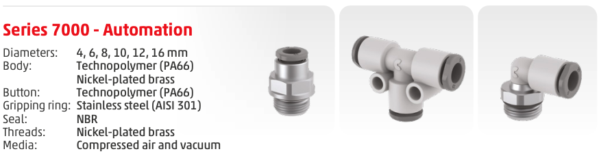 - Reinforced technopolymer (PA66) ensures durability and reliable sealing performance in pneumatic applications.